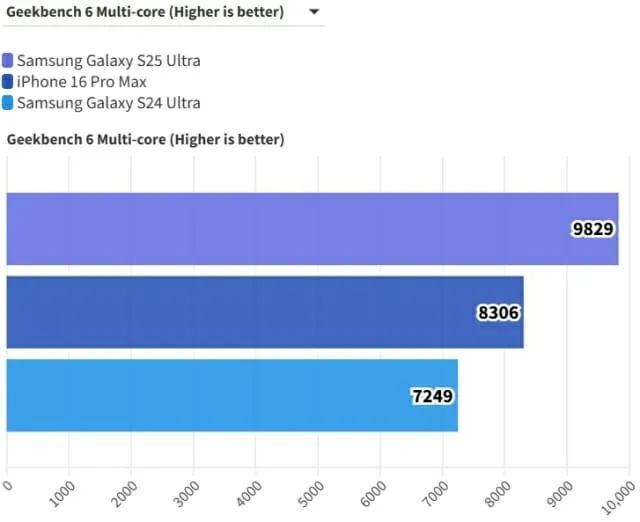 긱벤치 6.3 성능 평가에서는 갤럭시 S25 울트라가 멀티코어 점수 9,829점을 기록하여 아이폰16 프로 맥스의 8,306점, 갤럭시 S24 울트라의 7,249점을 모두 넘어섰습니다. 다만 단일 코어 점수에서는 아이폰16 프로 맥스가 3,386점으로 갤럭시 S25 울트라의 3,031점보다 11.7% 더 높았습니다. 하지만 이는 이전 모델의 2,300점보다 31.8% 개선된 결과입니다.